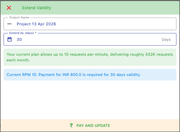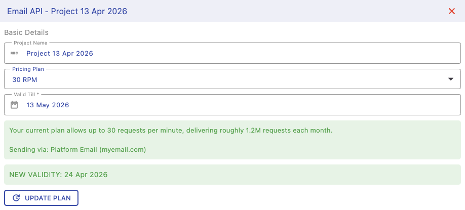 Extend your project validity to continue sending emails without interruption. Pricing depends on selected RPM plan and duration.