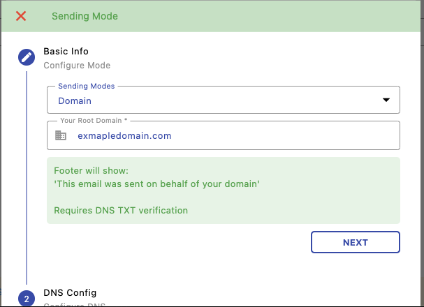 Domain mode requires DNS verification (TXT record). Once verified, your emails will show your domain in footer and headers.