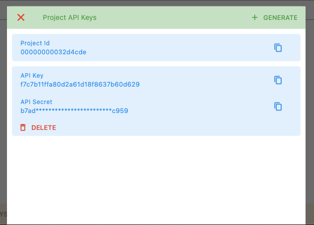 Generate and manage your API credentials including Project ID, API Key, and API Secret. These are required for authenticating requests to the NSFW API.
